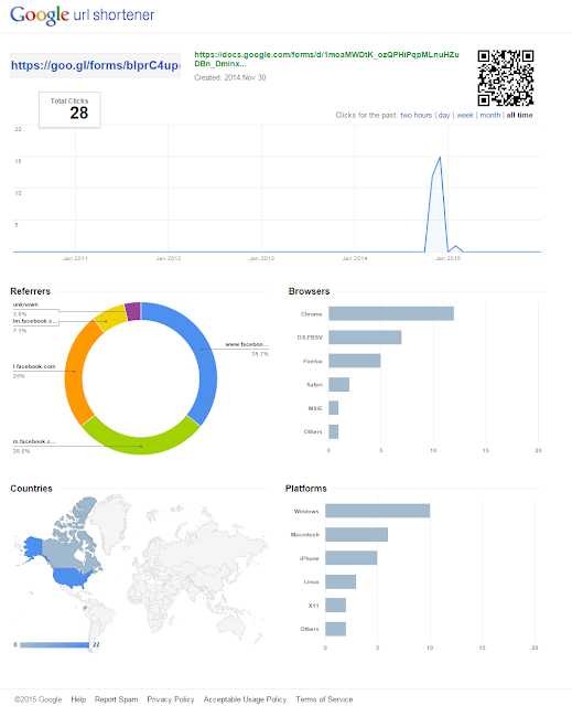 Google link analytics tell you the number of clicks, which sites people came from, the browser they used, the country they were in, and which platform they were on. Here is what that looks like:
