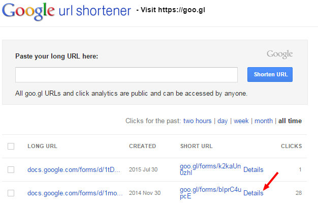 At the session, Ann Oro pointed out that in addition to checking out your Twitter Analytics, it's also a good idea to track links within your Tweets. (You can additional reflections from Ann here.) She suggested using Google Shortener which you can access at https://goo.gl. Once there, you paste in your long url and Google gives you a short one. After that you can visit https://goo.gl and click "Details" to find the analytics. Here's how you get to Google url shortener: